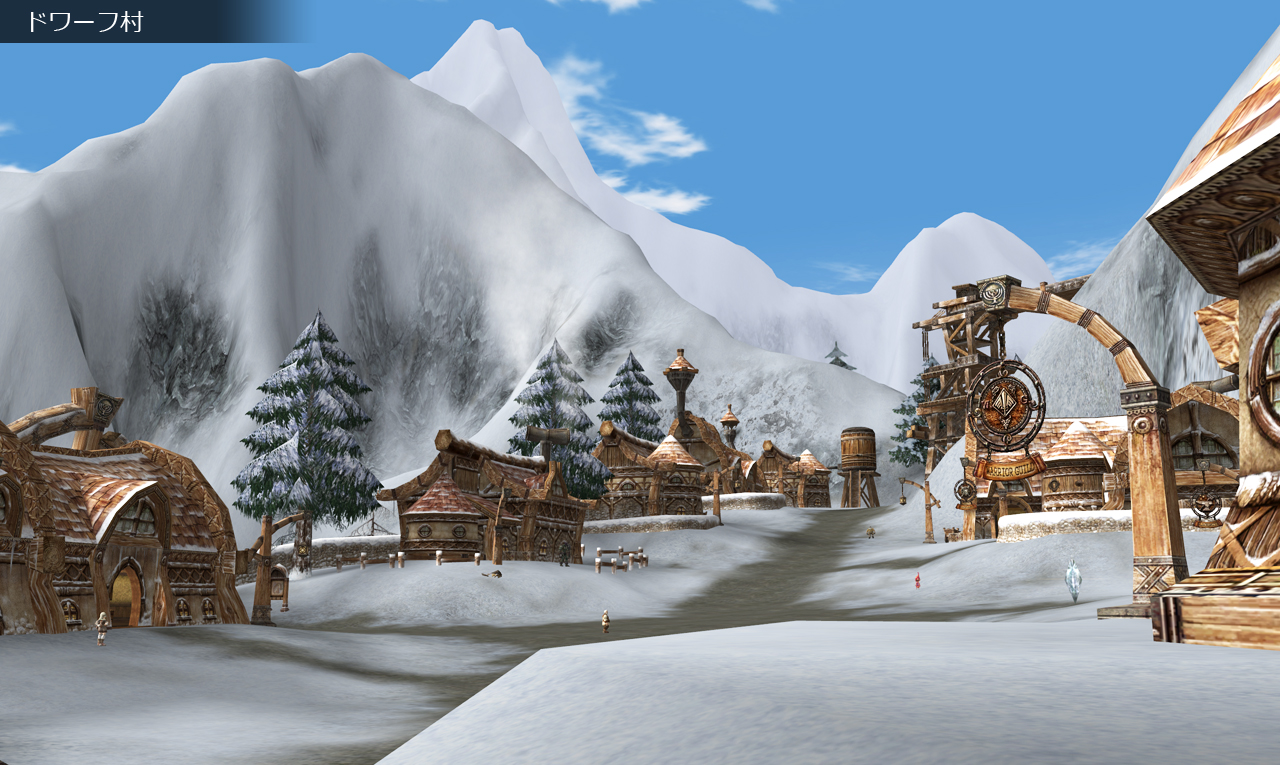 シュチュッツガルト領地に存在するこのドワーフ村は、一年中雪に閉ざされた村じゃ。今ではシュチュッツガルトよりも北に位置する一続きの陸地となっていますが、昔は歩いては行けない場所じゃったからの。今のヘルバウンドのように、隔絶された地域になっていたんじゃよ。いつのアップデートじゃったか、陸地が統合されてドワーフ村・オーク村に歩いて行けるようになったんじゃな。