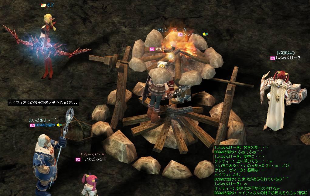 火打石でたき火を出してみたら、たき火の上に乗っかっちゃって^^;